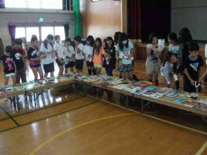 恒例の選書会が体育館で行われ,楽しみながら本を選んでいました。