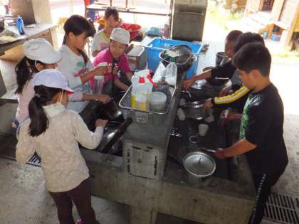 食器や鍋をしっかり洗いました。火の係は,かまどのプロに話を聞きました。