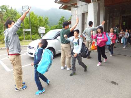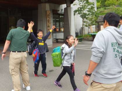 花背山の家退所名物のハイタッチで,職員さんに見送っていただきました。