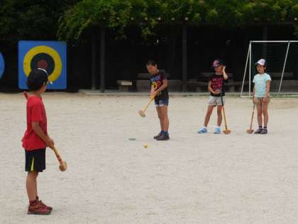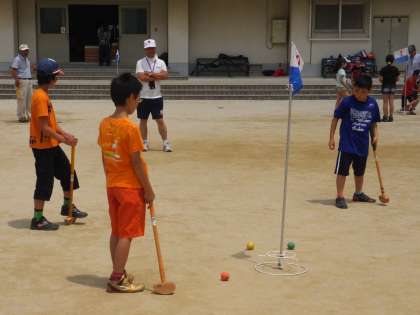 高学年は簡単そうに見えるグランドゴルフを,チームを組んで楽しみました。