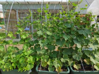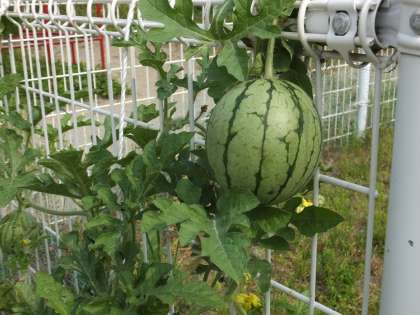飼育小屋前にはヒョウタンやスイカの実がぶら下がる緑のカーテンが順調です。