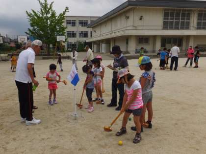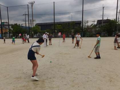 低学年はボールを打つだけで大変。高学年はゴールインワンも出て拍手喝采!