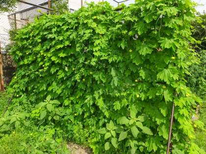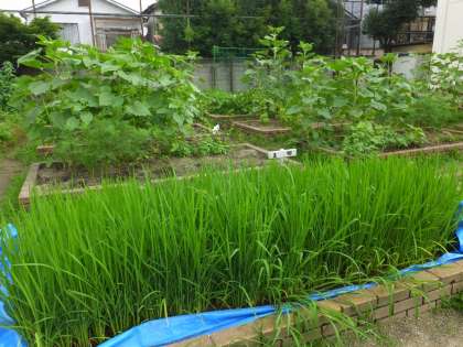 学習園には緑がいっぱい。ゴーヤの花が咲き誇り,イネも順調に育っています。