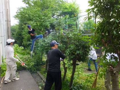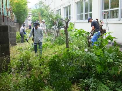 北校舎裏は草や樹木が生い茂り,日照や風通しが悪くなっていました。