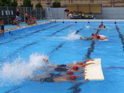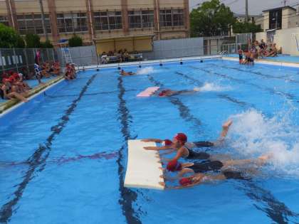 男女協力してのロングビート板リレー!