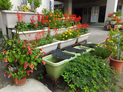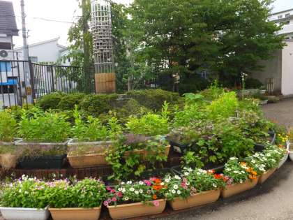 正門にサルビアがこの夏咲き続け,これからベゴニア・ケイトウが咲き誇ります。