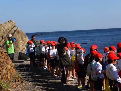 広く青い大海原を眺めて,地球が丸いことを実感して叫んでいました。