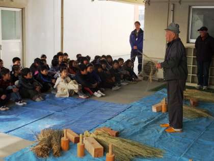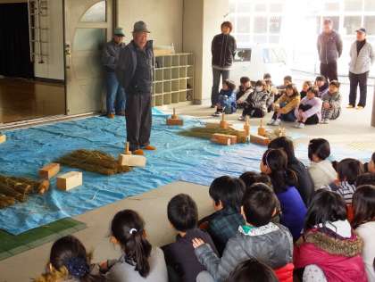 3年社会科「昔のくらし」の学習で,わらない体験をしました。