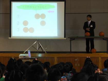 「おはじきを科学する」というテーマで,校長先生の実験を見ました。