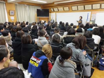 お話を聞いて,たくさんのお土産を持って帰っていただきました。