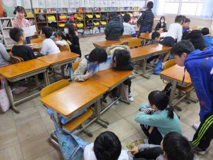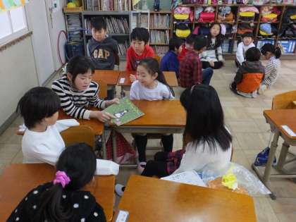 朝学習時に縦割班で集まり,2年生からの読み聞かせを楽しみました。
