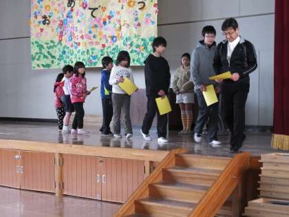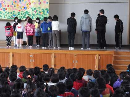 給食委員会企画のマメつまみ大会で校長先生は3位入賞で表彰です。