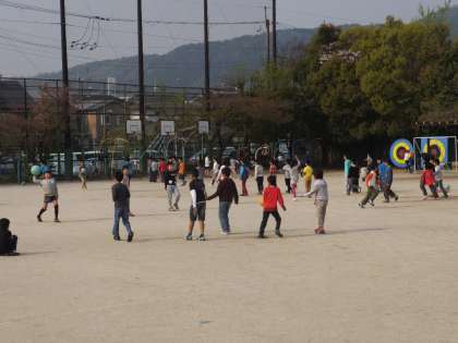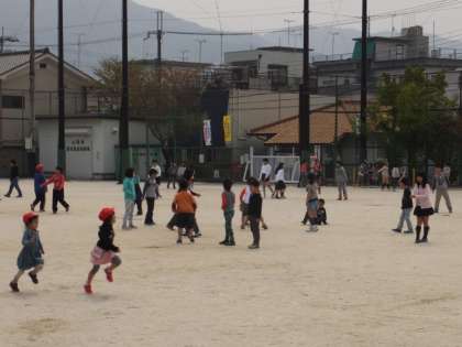 穏やかな天気の下で,子どもたちは元気いっぱい走り回っています。