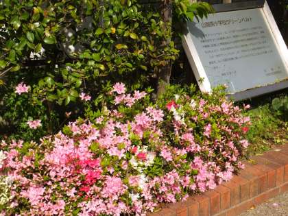 正門前の八重桜が満開を迎え,グリーンベルトにも花が咲き出しました。