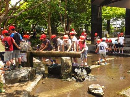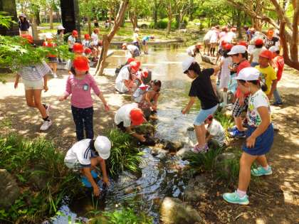 自由時間には水遊びが大人気で,たくさんの生き物を発見していました。