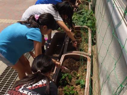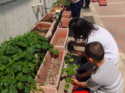 土作りをした後,ヘブンリーブルー(西洋アサガオ)の苗を植えました。