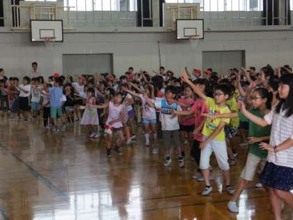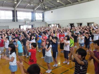 全校みんなが音楽に合わせて体を動かし,元気いっぱいノリノリです。