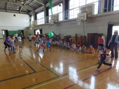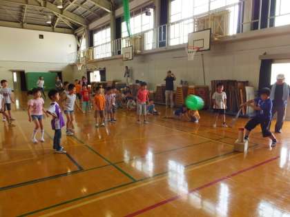 低学年はソフトバレーボールを使ってティーボールを楽しみました。
