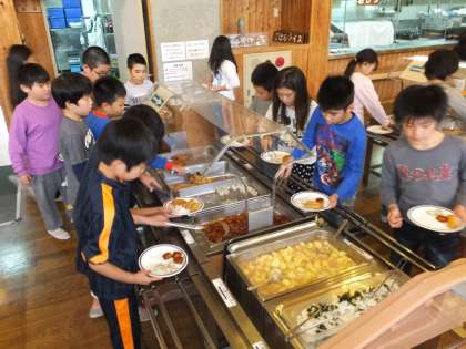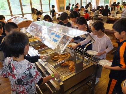 ハンバーグ・春巻き・白身魚フライなど,豪華なおかずの山盛りです。