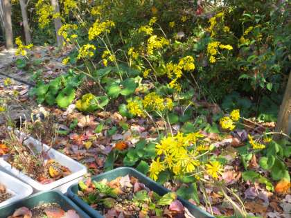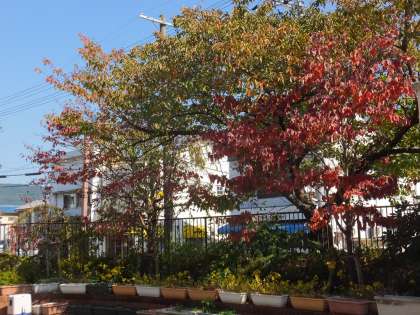 正門付近のサクラは紅葉し始め,ツワブキの花も美しいです。