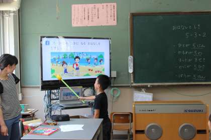 絵を観ながら,5−3=2の問題を考えています。