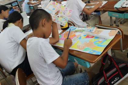 図画の作品を一生懸命に描いている児童もいます。
