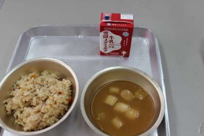 今日の給食は,台風などに備えて学校で保管しておいた乾燥物や缶詰を使って作りました。
