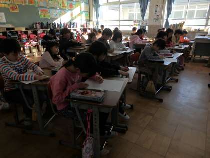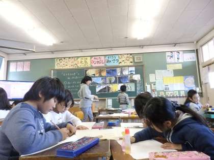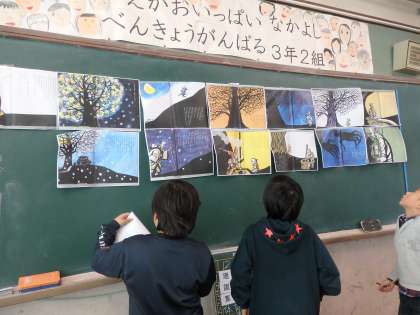 3年生の図工の様子です。国語で学習した「モチモチの木」の好きな場面を紙はんがにします。豆太やモチモチの木のバランスを考えて下書きをしました。どんな版画ができあがるのか楽しみです。