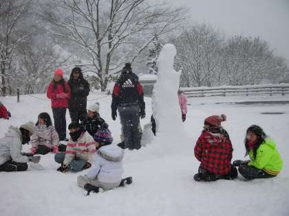 朝食後、各学級、男女ごとに雪の造形にチャレンジしました。各グループごとに思い入れや工夫があり、途中で雪と戯れたり雪に埋もれたりと雪の感触をたくさん味わいながら、作品作りをしました。
