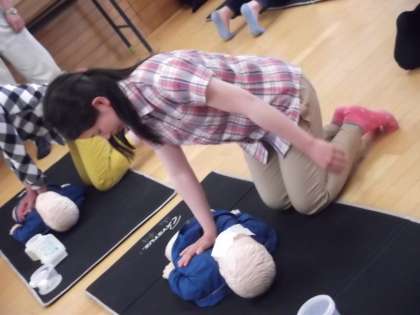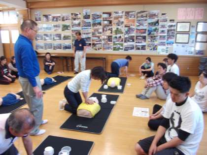 毎年実施している普通救命講習を今年も行いました。山科消防署より来てくださった救急救命士のお話を聞いた後,心肺蘇生法の練習や,実際AEDを使っての練習もおこないました。教職員一人ひとりが「子どもの命を守りきる」という意識と責任感をもって講習を受けました。