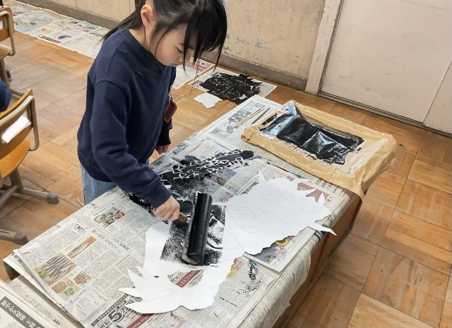 一生懸命作った紙版がにインクをつけて、刷りました。