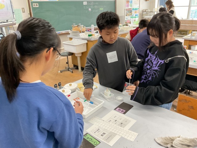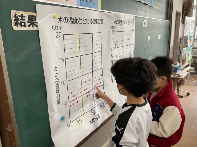 今日は、「水の温度を上げると、水にとけるものの量はどのように変わるのか」の実験をしました。水の温度を10℃、30℃、60℃と変えたときの、食塩とミョウバンがとける量を比べました。とけるのか、とけないのか、興味津々で実験をしていました。また、実験結果をもとに、どのような関係があるのかじっくりと考察していました。