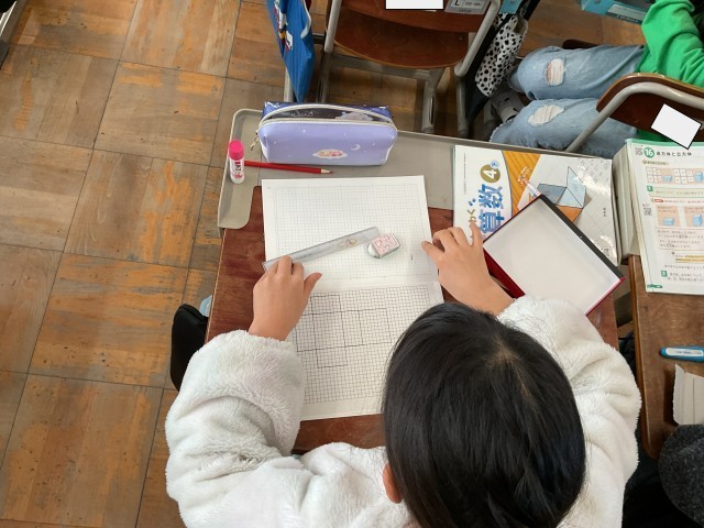 4年生の算数では、直方体と立方体の学習に取り組んでいます。前回、直方体と立方体の特徴を学び、今日は辺にそって切り開いた図を書くことに挑戦しました。イメージがわきにくく苦戦している様子もありましたが、繰り返し練習しマスターしてほしいと思います。