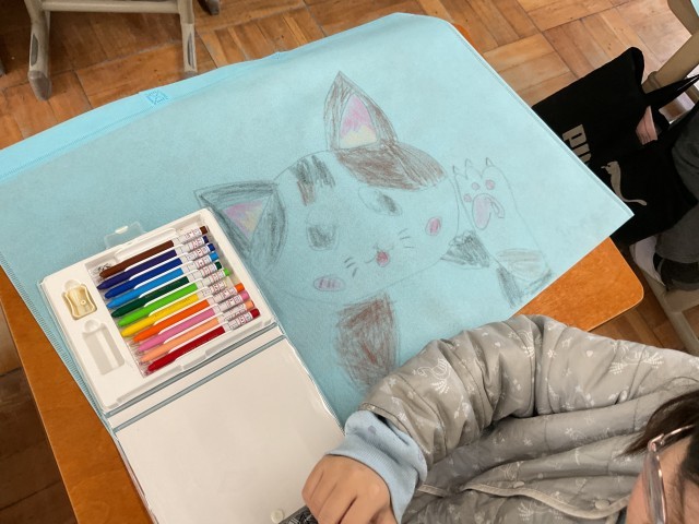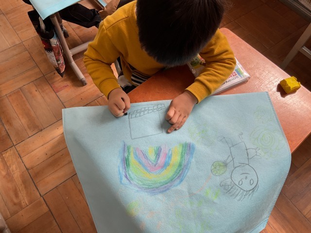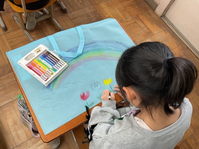 1年間、図工で作った作品を持ち帰る作品バッグに絵を書きました。1年間の思い出や好きになったものを思い思いに描いていました。