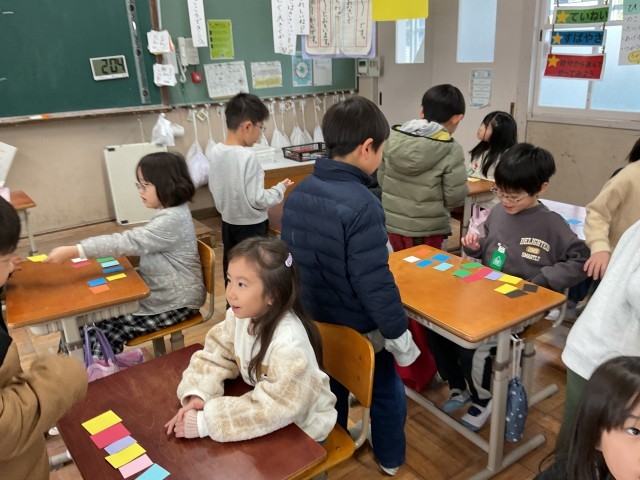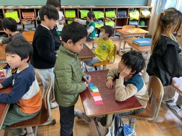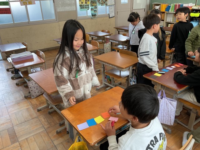英語では、色を使った学習を進めています。カラフルな蝶々を作るために、「〇〇 please.」「Here you are.」などの表現を使いながら、欲しい色を集めました。