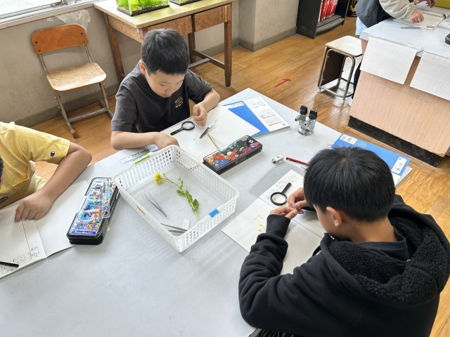 新しい年度が始まり、新たな出会いや学びがどんどん始まっていきます。今日は、さっそく理科の学習が始まりました。新たにお世話になる専科の先生との出会いのあとは、すぐにアブラナを手に取ってルーペやピンセットを駆使しながら観察を行いました。授業の導入では、「菜の花‼」とつぶやいていた児童も終わりがけには、「アブラナ‼」と口にしていました。