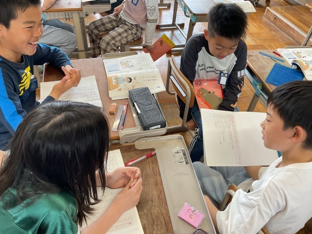 5年生初めての国語の授業では、自分の名前を使って自己紹介を行いました。友達の知らないことを伝えようという目標をたて、じっくりと考える姿が見られました。交流の時には、「えー!一緒!!」と盛り上がっていました。