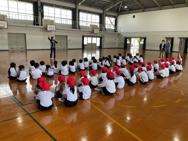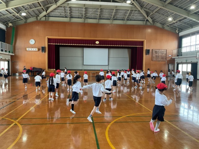 1年生全員で体育館に集まり、体育の学習をしました。音楽に合わせて動物の動きを真似たり、猛獣狩りではたくさんの友だちと輪を作ったりし、全力で楽しむことができました。