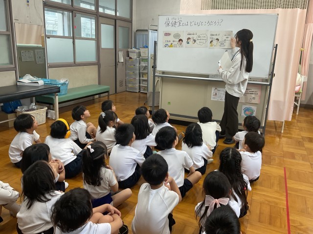 身体計測を行いました。保健室に行き、困ったときや怪我をしたときはどうしたら良いかと考えながらお話を聞くことができました。みなさんの、これからの成長が楽しみです。