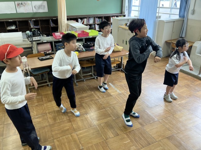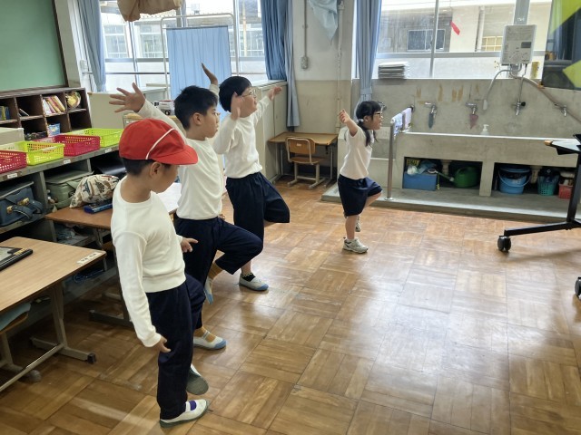 お手本を見てポーズ!タイミングよくジャンプ!笑顔で取り組見ました。