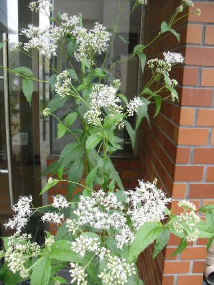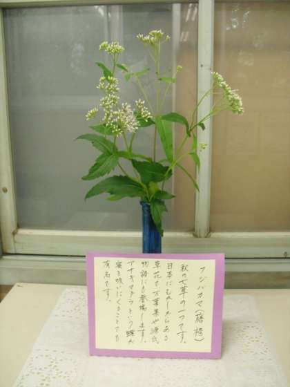 玄関に置いている鉢植えのフジバカマが咲き始めました。秋の七草のひとつであるフジバカマは,日本古来の草花で万葉集や源氏物語にも登場します。葉を乾燥すると,桜餅に似た香りがそこはかとなく漂います。渡りの蝶であるアサギマダラが,この花に寄ることで知られています。目立つ花ではありませんが,昔から日本人に愛されてきたフジバカマに,季節の移り変わりを感じてほしいものです。