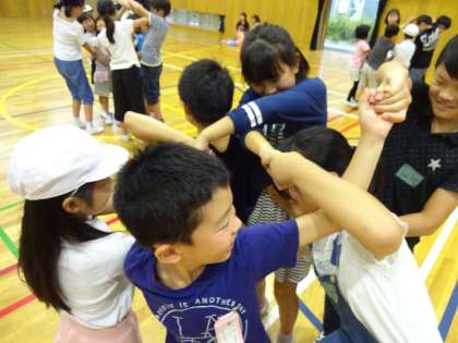 縦割りグループで一緒に活動するのは2回目ですが,今回は体育館で「ドン!じゃんけん」,「マッチングゲーム」「人間知恵の輪」です。