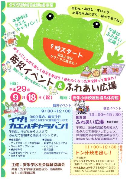 安朱学区社会福祉協議会主催の「防災イベント」と「ふれあい広場」が開催されます。