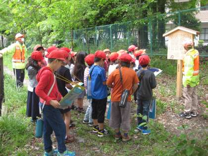 社会科の学習で校区探検に行きました。安朱の校区にある(た)てもの(こ)うつう(む)かしのもの(し)ぜんの「たこむし」を合言葉に,見守り隊の方と一緒に探しに出かけました。