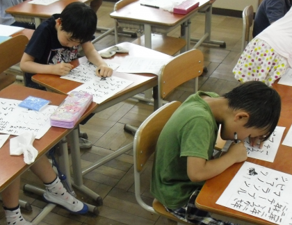これまで学習してきた,カタカナの字形や筆順などを確認しながら,心を落ち着けて書きました。写真は,お手本を見て,一画一画ていねいに書いている時の様子です。