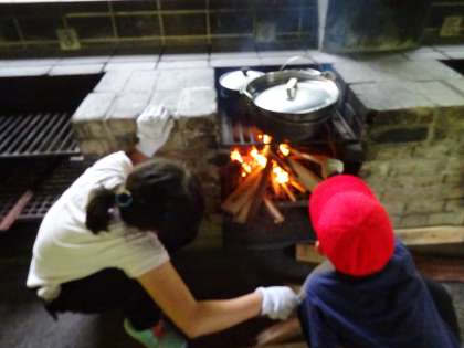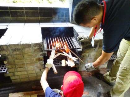 かまど担当の子どもたちは,薪の組み方や入れ方を教えてもらった後,実際に火をつけます。