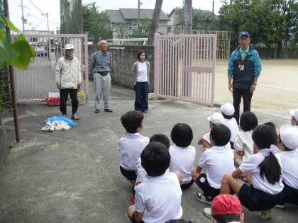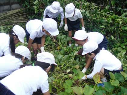 春に植えたサツマイモが子どもたちの顔と同じぐらいの大きさにまで成長しました。そんな大きなサツマイモを掘るために地域の方にも協力していただき,たくさんのサツマイモを収穫することができました。