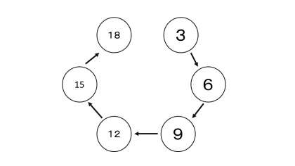 きのうの答えは「18」です。丸の中の数字が3ずつ増えているのに気が付きましたか?