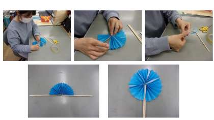 先生もまるくひらくおうぎを作ってみました。教科書のp11を見ておうぎを作ってください。また,KBS京都でも放送されたものを見た人もいると思います。