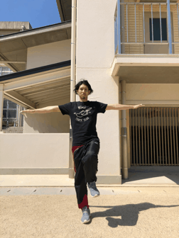 両手を大きく広げて片足でバランスを取ります。
